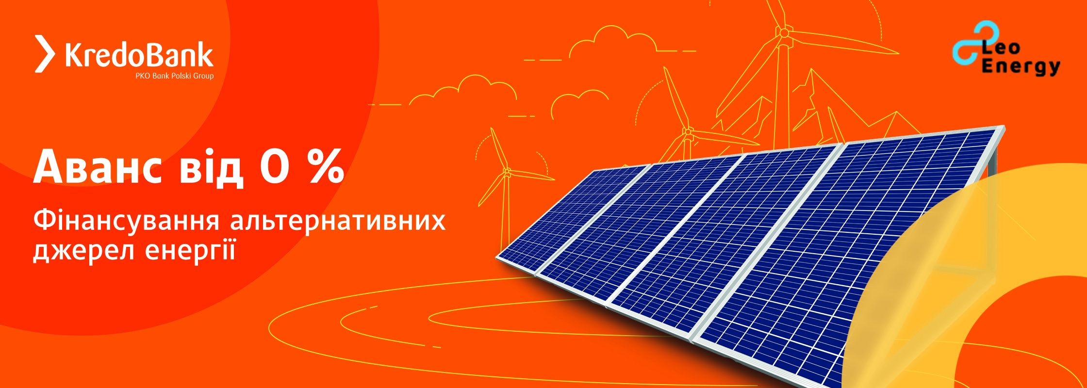 Кредобанк спільно з компанією LeoEnergy пропонують скористатись вигідними умовами партнерської програми для встановлення сонячних електростанцій та комплексних рішень з енергоефективності для підприємств (газопоршневі генератори, вітрові електростанції, накопичувальні системи).