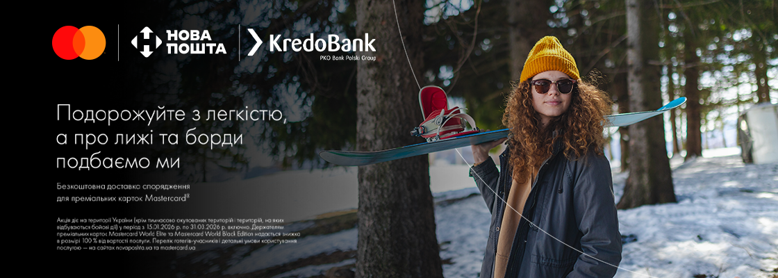 Користуйтеся сервісом «Доставка катання» від Mastercard та Нової пошти — безкоштовною доставкою гірськолижного спорядження від вашої адреси до курорту та назад із преміальною карткою Mastercard.