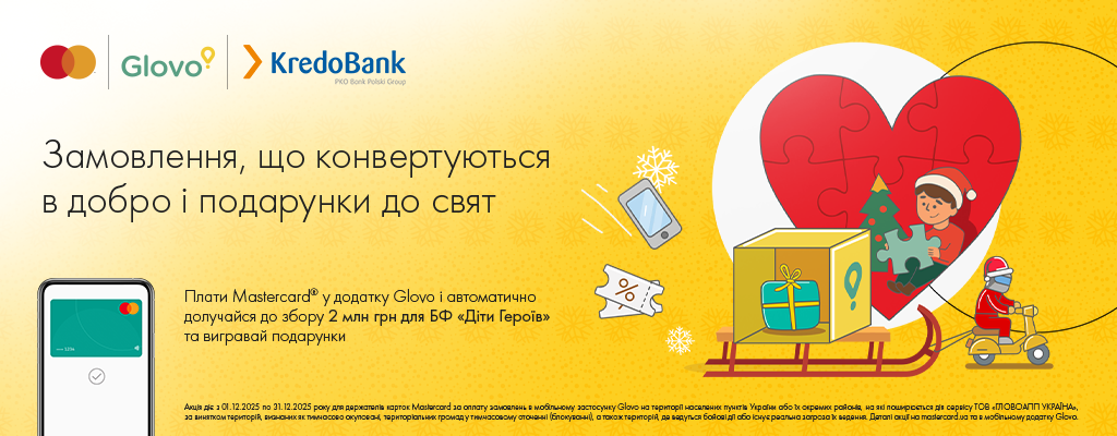 Glovo та Mastercard об'єдналися, щоб ваші замовлення перетворювалися на добро і додаткові подарунки. Кожна оплата карткою Mastercard у Glovo автоматично долучає вас до збору 2 млн грн на потреби Благодійного Фонду «Діти Героїв», який допомагає дітям, які втратили одного чи обох батьків унаслідок війни. А також серед усіх, хто підтримає нас у цій добрій справі, ми розіграємо заохочувальні подарунки.