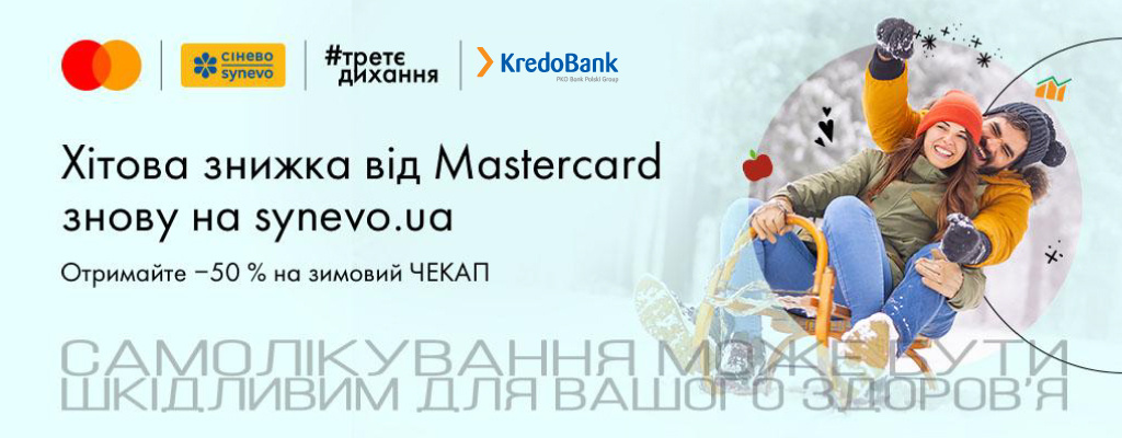 Акція діє з 10.12.2025 р. по 28.02.2026 р. для держателів карток Mastеrcard®, емітованих банками України, у відділеннях медичного центру «Сінево» (synevo.ua/info/centers), окрім тих, адреси яких зазначені за посиланням: https://www.synevo.ua/info/agr…, за умови оплати на synevo.ua без використання будь-яких інших знижок та/або бонусів пакета № 126.1 (код послуги 10 328). Послуга взяття крові одноразовими інструментами обов’язково додається до замовлення та додатково становить 90,00 грн. Вартість пакета № 126.1 «ЧЕКАПнись на повну» (код послуги 10 328) без знижки становить 3960,00 грн. Деталі й умови акції — на mastercard.ua та synevo.ua/info/discount-conditions. Реклама методу діагностики.